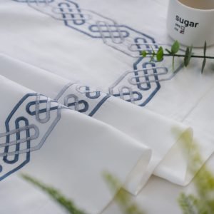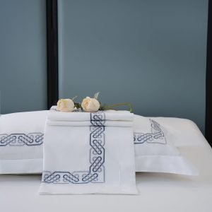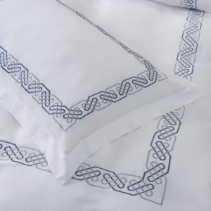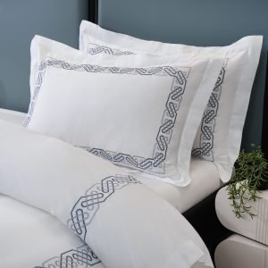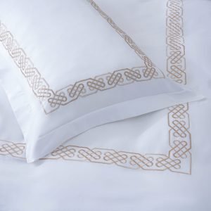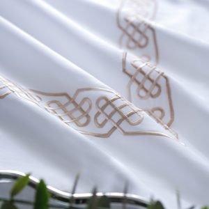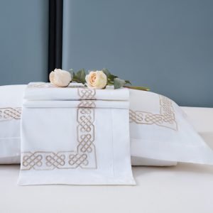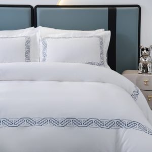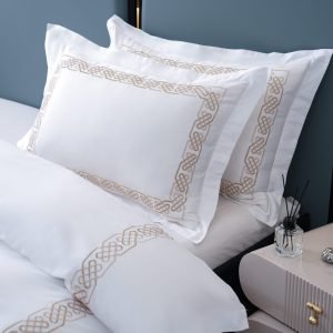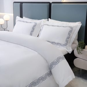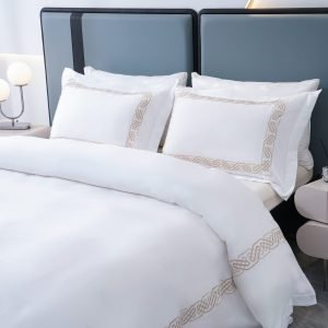 A premium, luxurious 300-thread count cotton bedding set featuring a sophisticated design with an embroidered border pattern. The embroidery displays intricate motifs in a neutral tone, complementing the crisp white fabric of the pillowcases. The hypoallergenic material ensures comfort and suitability for sensitive skin, while the precise stitching highlights exceptional craftsmanship and attention to detail. Made from high-quality materials, the clean lines and elegant design make this bedding perfect for luxury interiors or high-end hospitality settings.