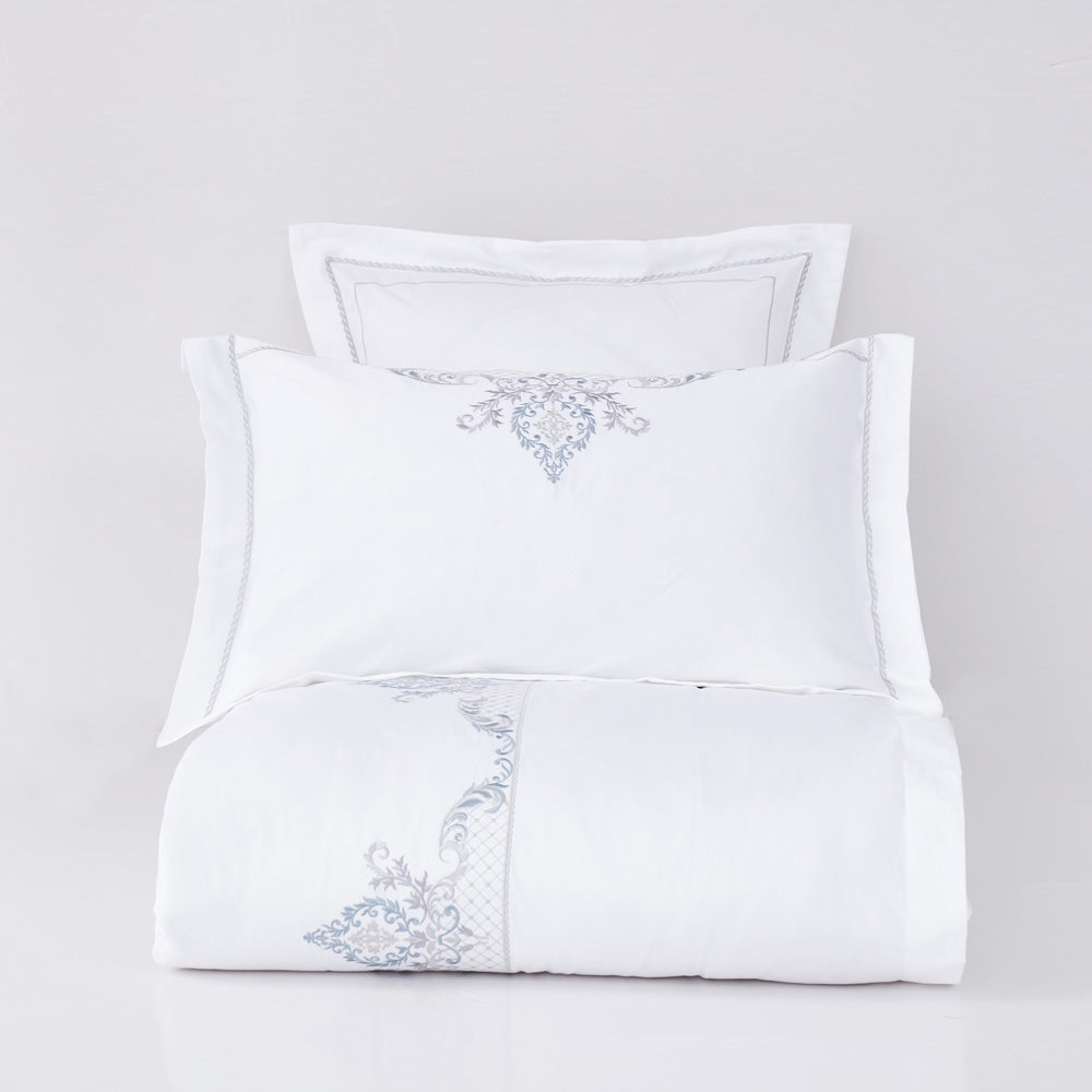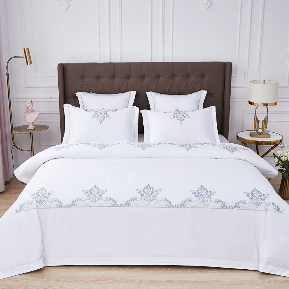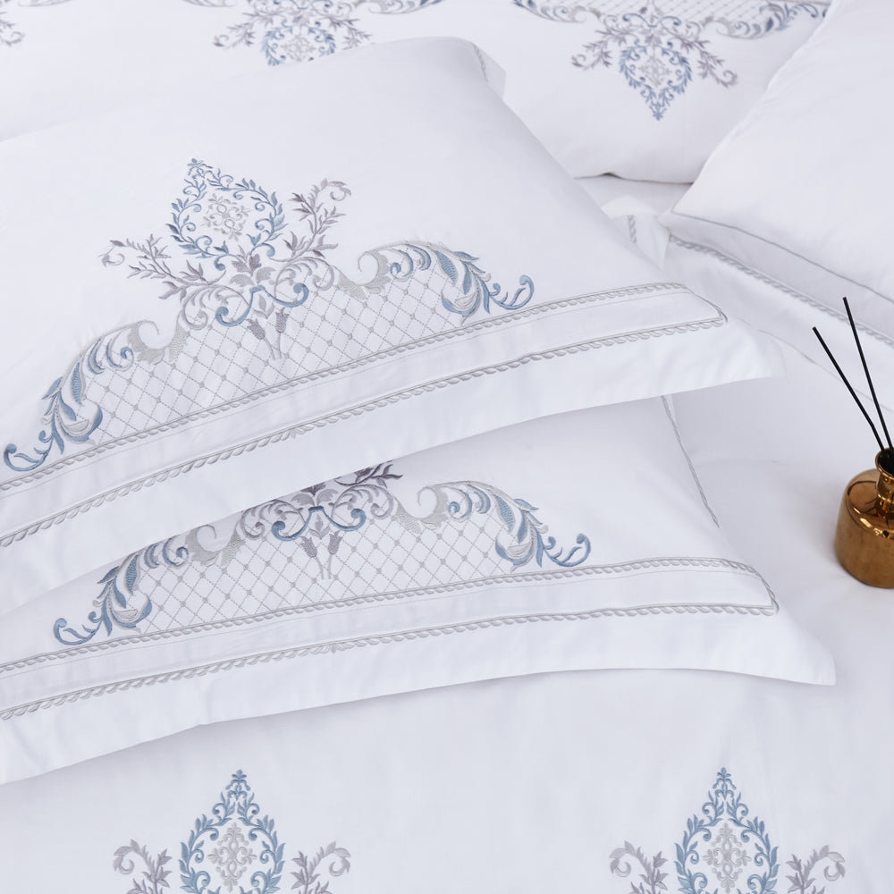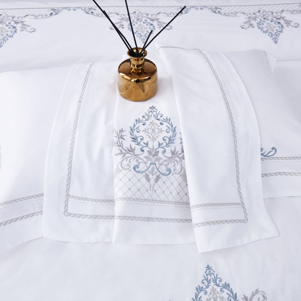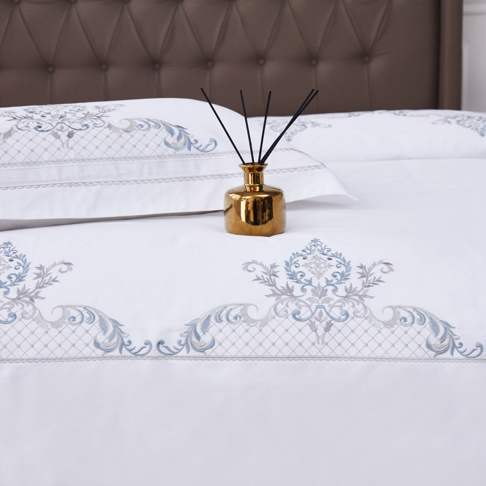 The pristine white base, highlighted with delicate blue embroidered motifs, brings a serene, sophisticated charm that complements both modern and classic interiors.