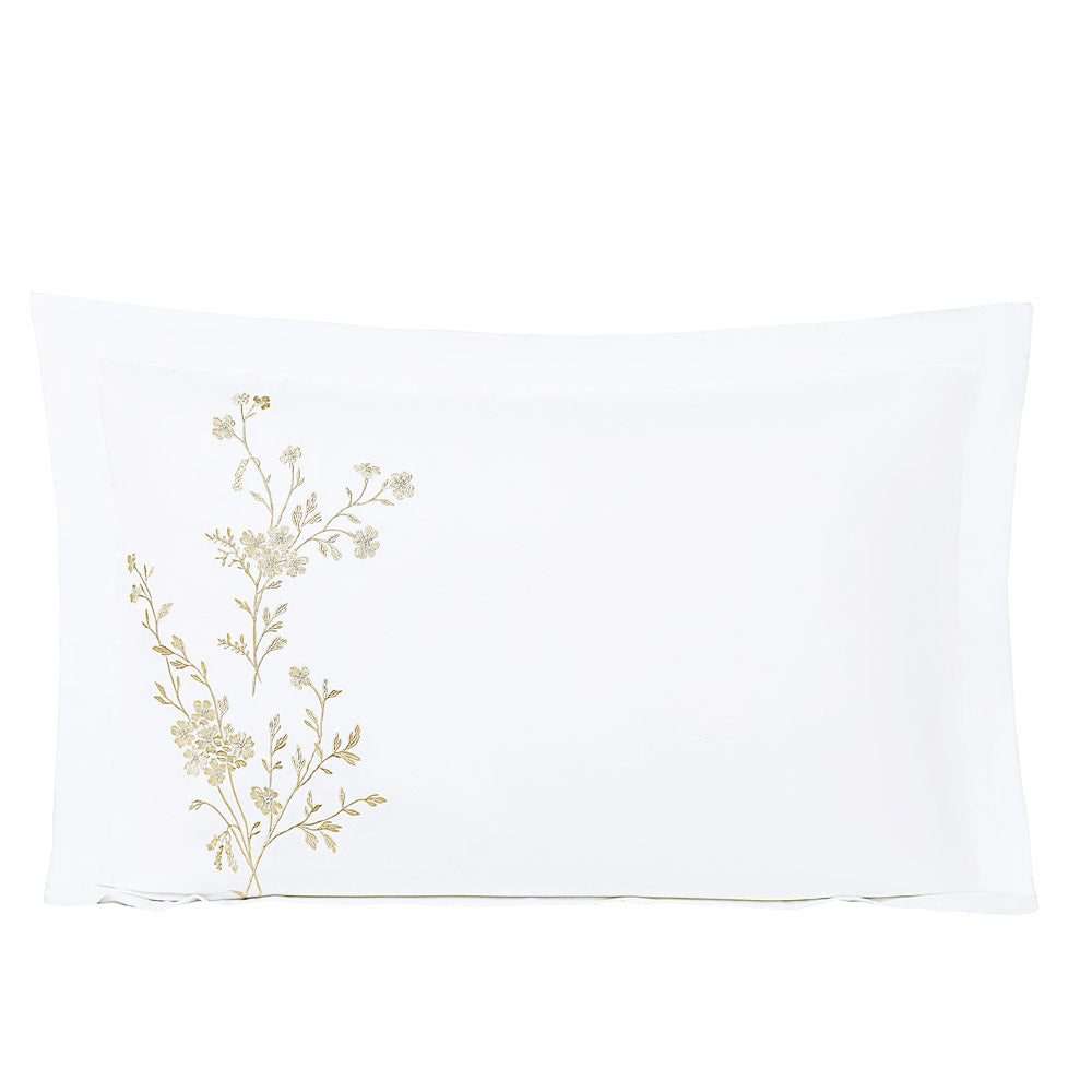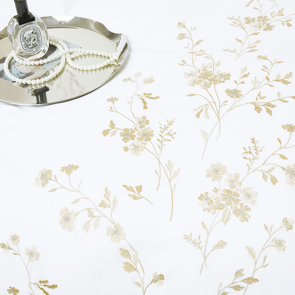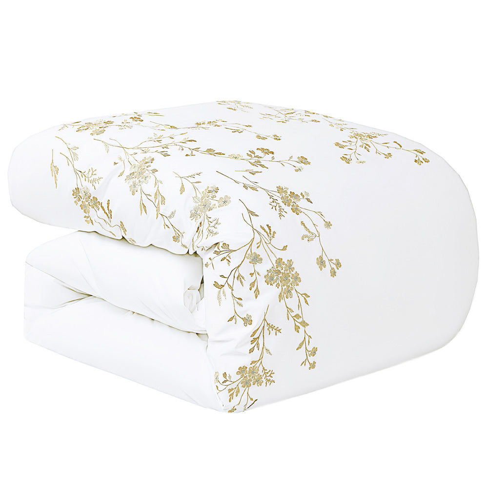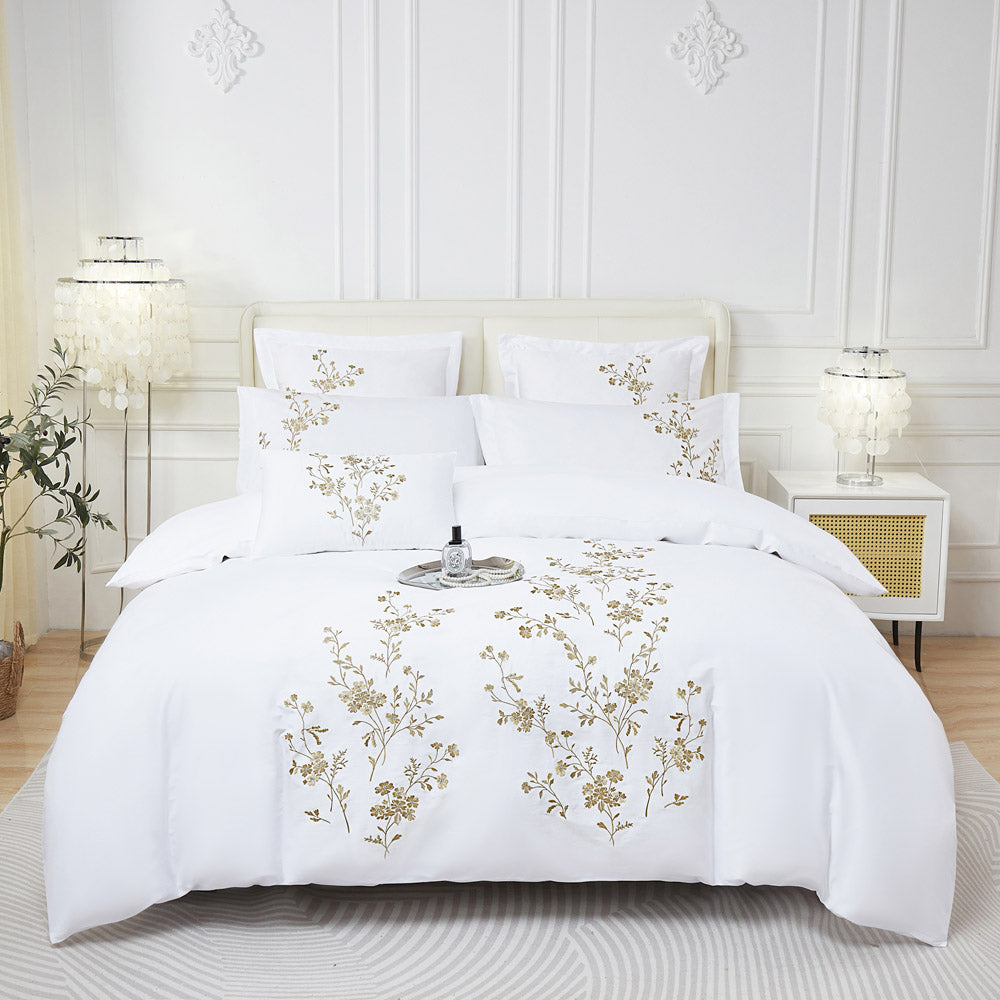 Create a serene, hotel-inspired bedroom with this exquisite white bedding set, beautifully detailed with delicate botanical embroidery. Fine branches and blossoms in soft gold and warm beige tones are gracefully embroidered across the duvet and pillows, adding a refined artistic touch to the crisp white base.