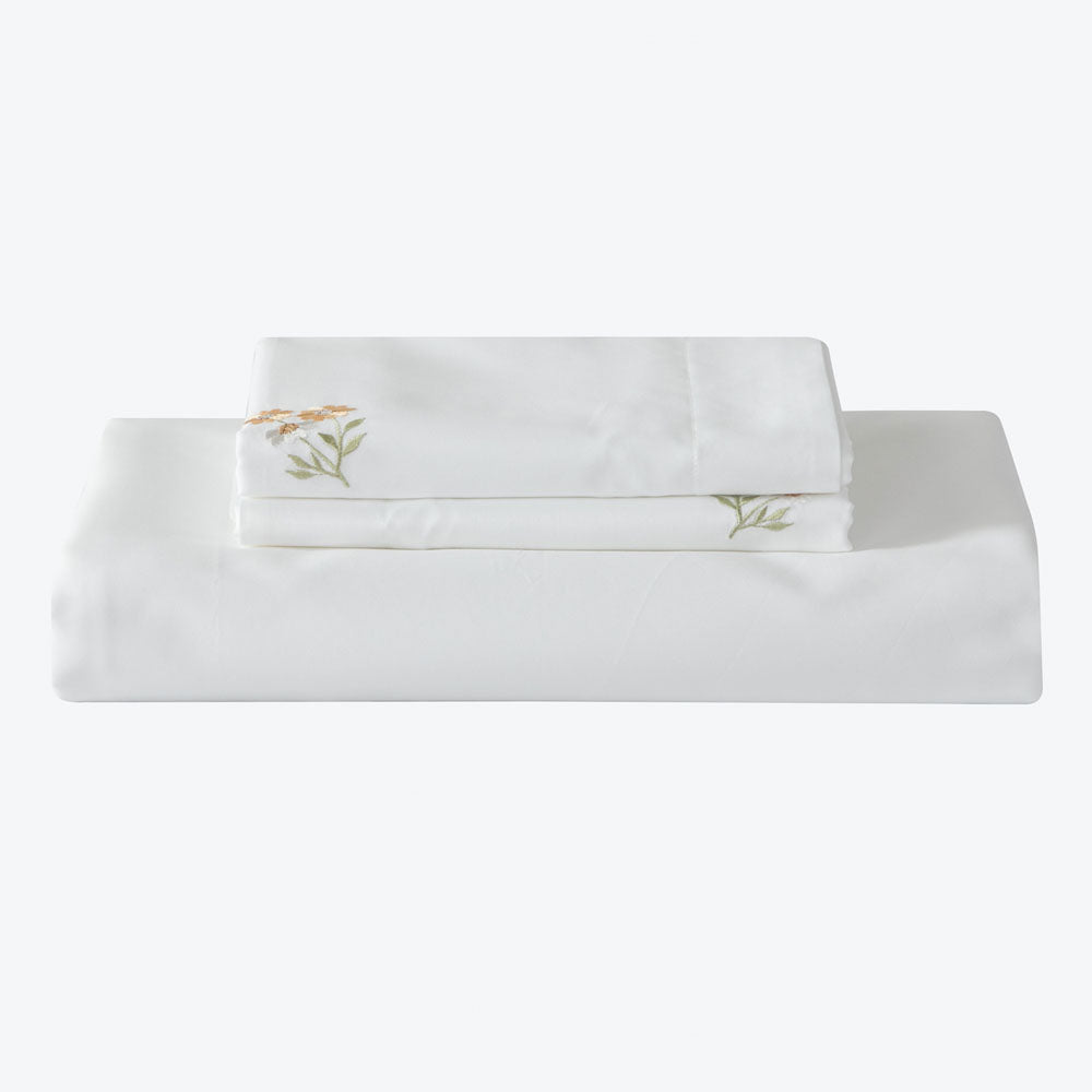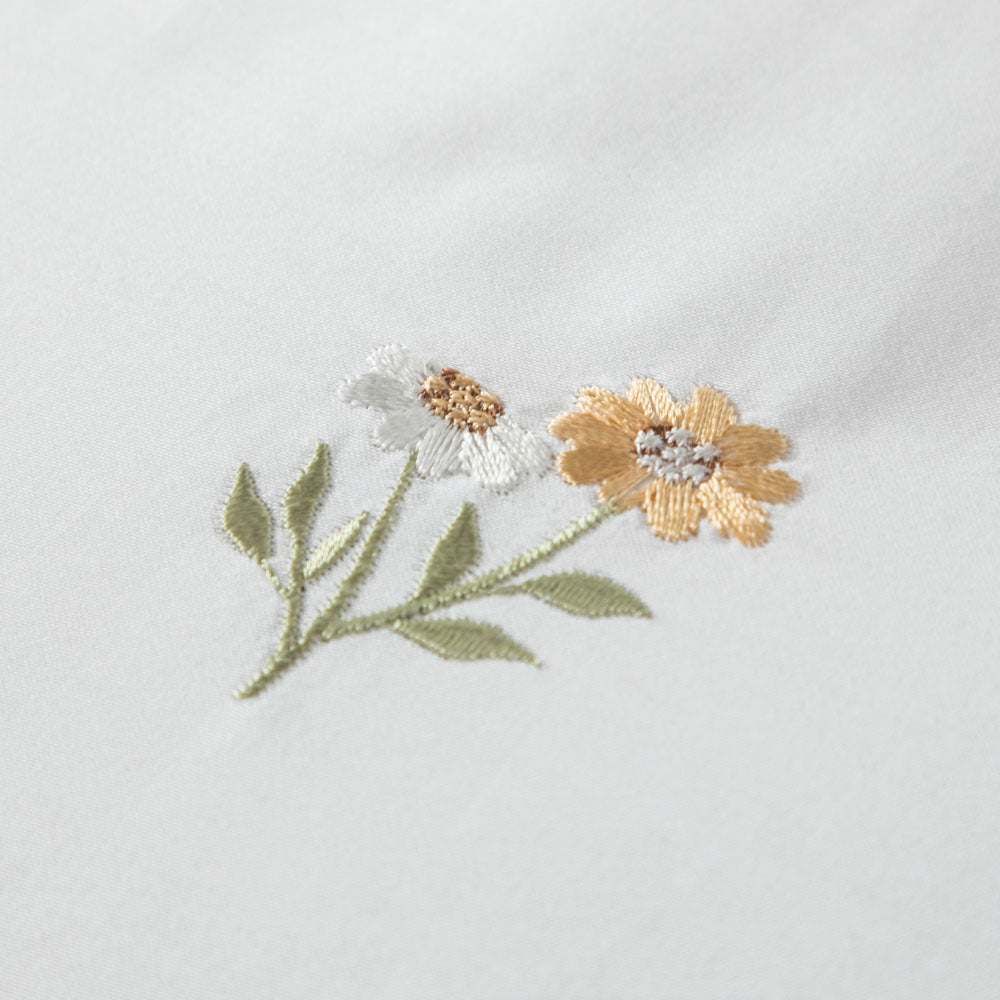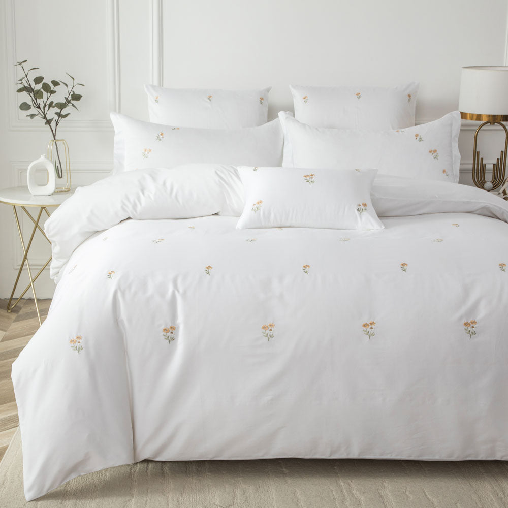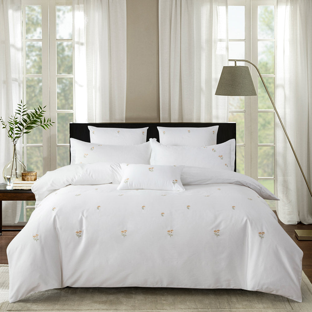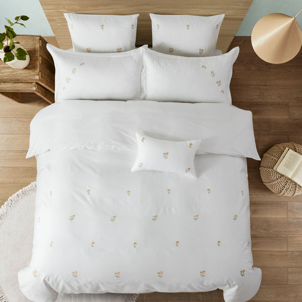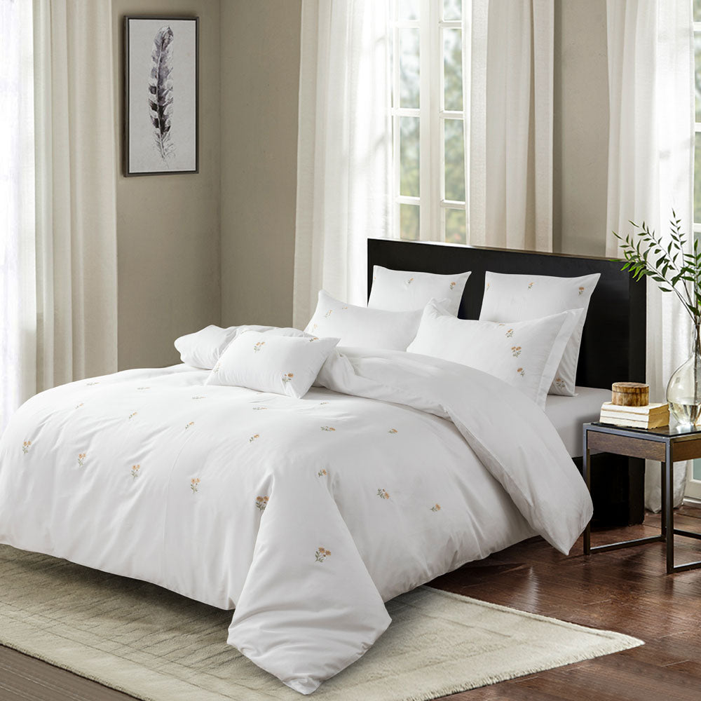 Bring soft charm and understated elegance to your bedroom with this beautifully crafted white bedding set. Designed with a clean white base, the fabric is adorned with delicate embroidered floral motifs in warm, subtle tones, creating a fresh and calming aesthetic.