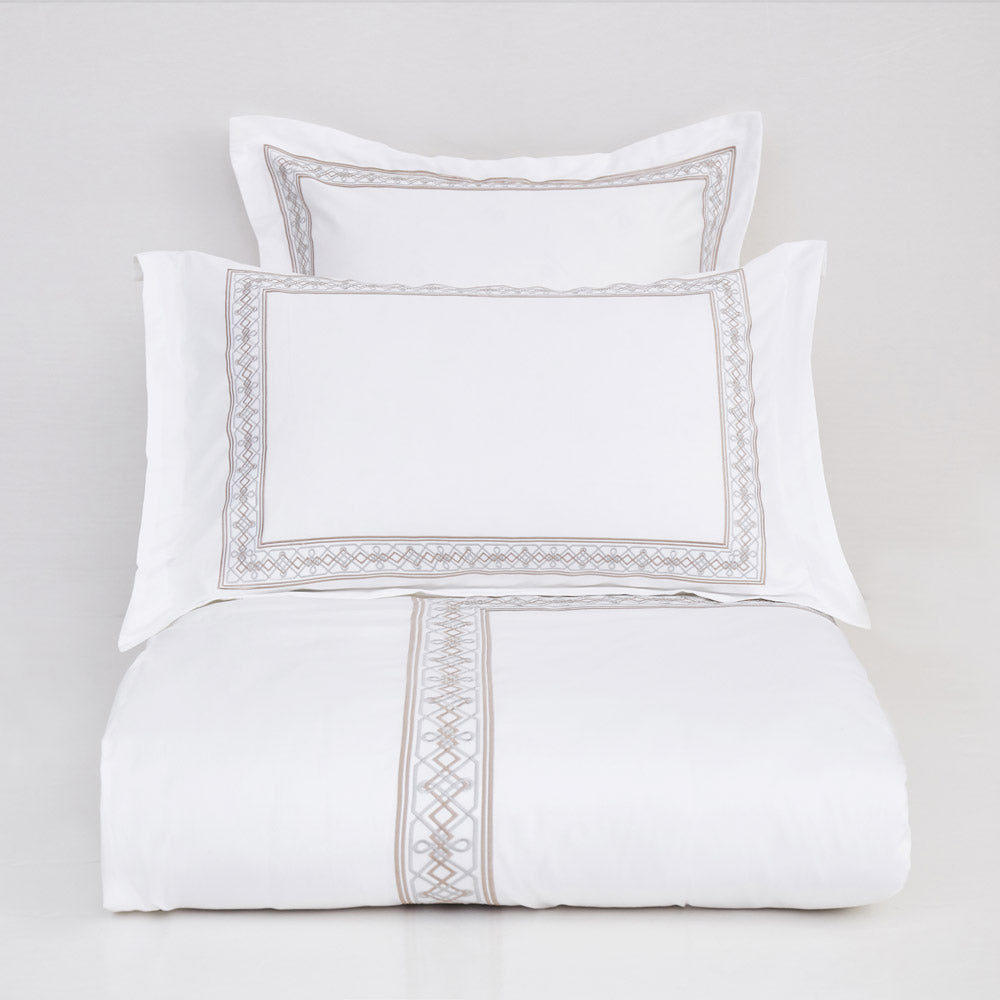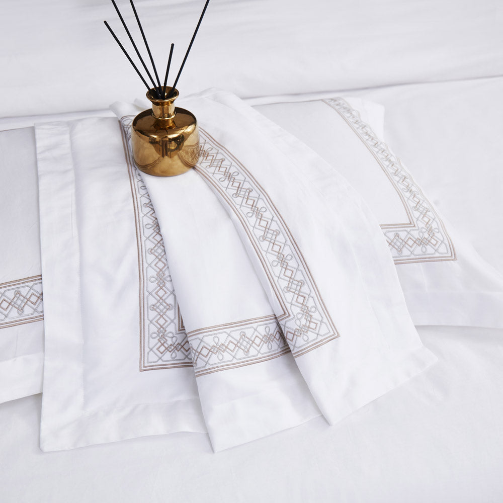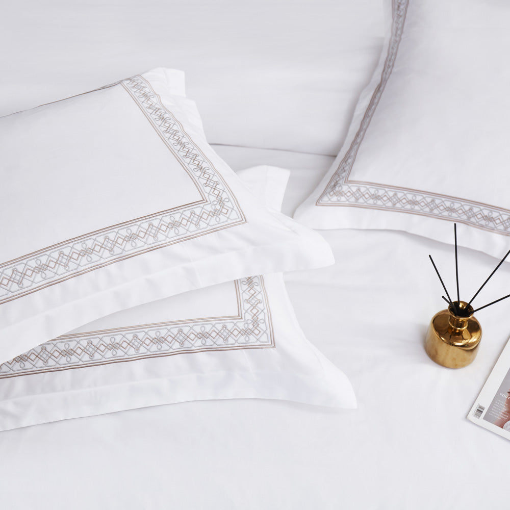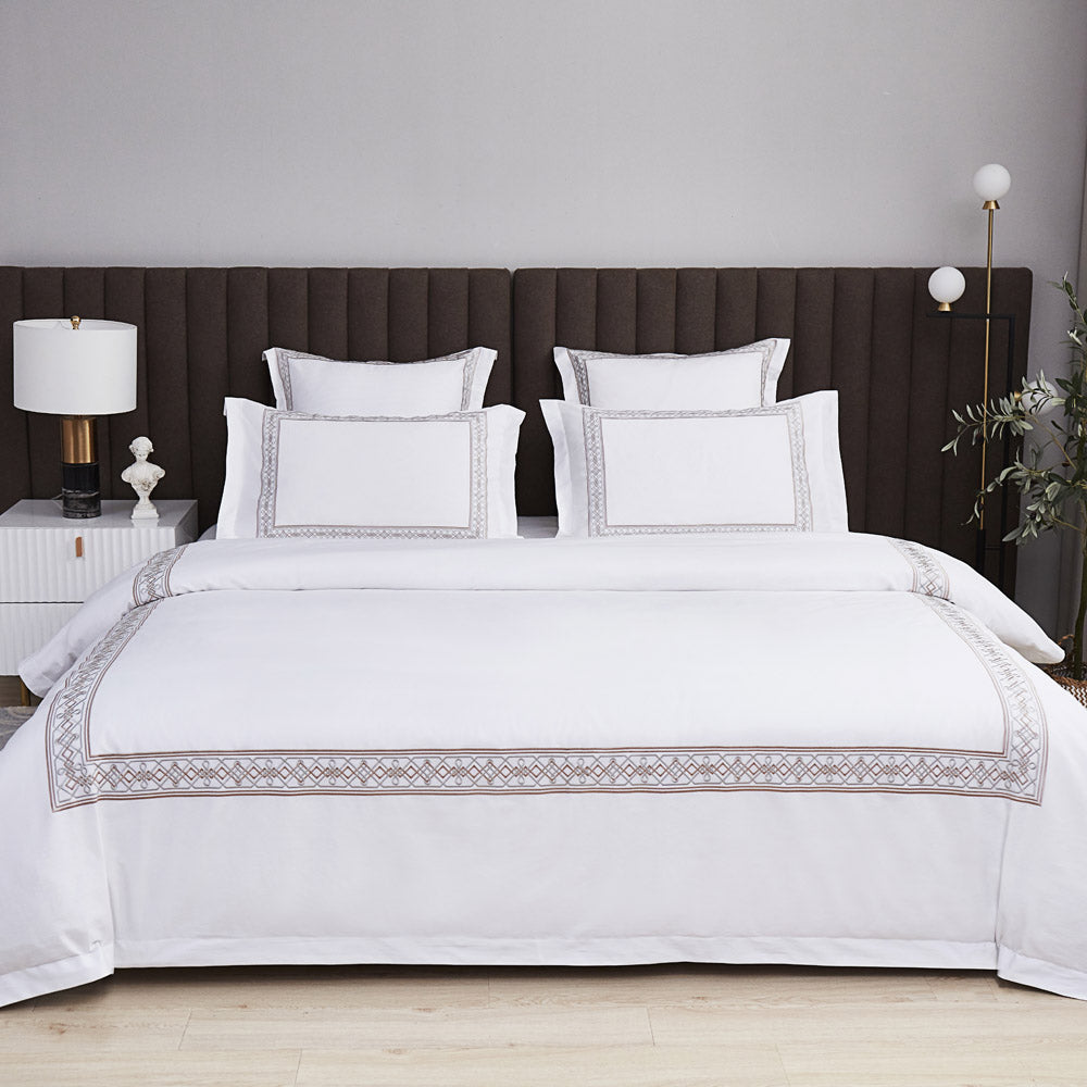 This elegant 4-piece bedding set features a refined white base accented with delicate geometric embroidery in soft champagne tones. Designed for a sophisticated and modern bedroom aesthetic, it offers a smooth, luxurious feel with a beautifully finished look.
